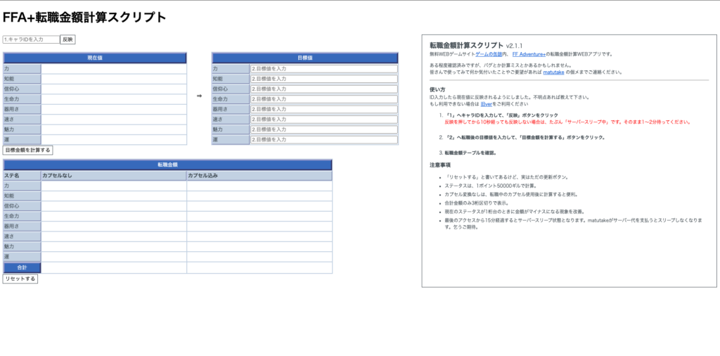 WEBアプリケーションFFAdventure+転職金額計算スクリプトv2.0.0リリースしました。